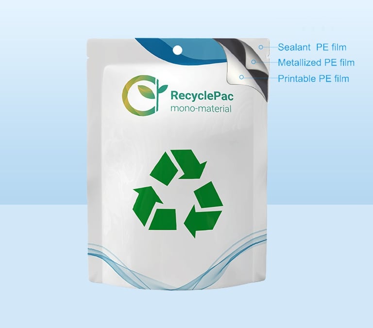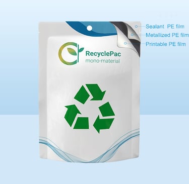 Made from polyethylene (PE) with a metalized layer, ensuring recyclability and high barrier properties.
